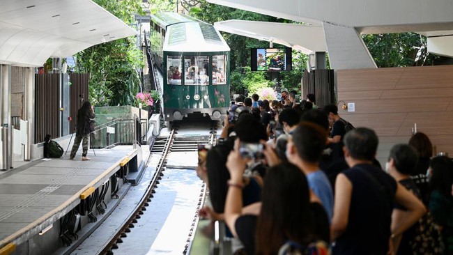 Orang-orang menaiki Peak Tram generasi keenam di Hong Kong, China. Peak Tram generasi keenam secara resmi dioperasikan pada hari Sabtu, (27/8/2022). Peak Tram sempat ditutup karena renovasi yang dilakukan sejak Juni 2021 lalu. Baru pada 27 Agustus 2022, Peak Tram akhirnya dibuka kembali. (Li Zhihua/China News Service/Getty Images)