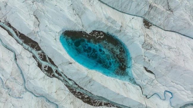 Lanskap ini memperlihatkan sebuah danau di Greenland yang bentuknya menyerupai hati. Foto drone ini dijepret pada 16 Agutsus 2022.