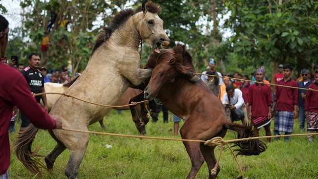 Serunya Tradisi Tarung Kuda Jantan di Selat Tiworo, Sultra