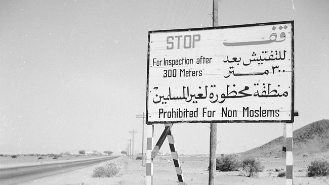 Ini salah satu potret rambu lalu lintas yang memperingatkan bahwa nonmuslim dilarang masuk ke Kota Suci Mekah pada tahun 1956.