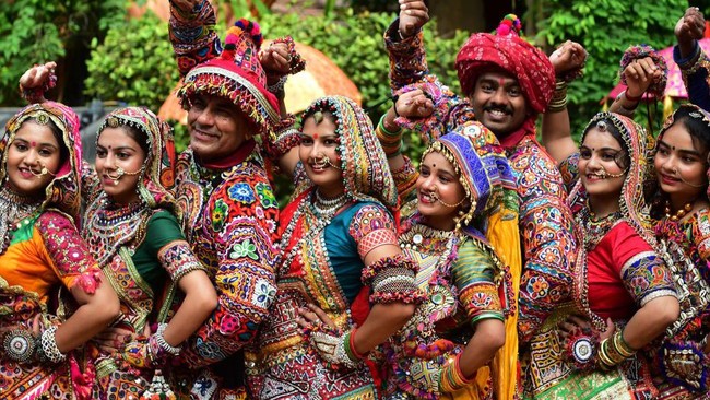 Peserta dari kelompok seni yang mengenakan pakaian tradisional berpose saat latihan tari Garba menjelang festival Navratri di Ahmedabad, India, Selasa, (20/9/2022).