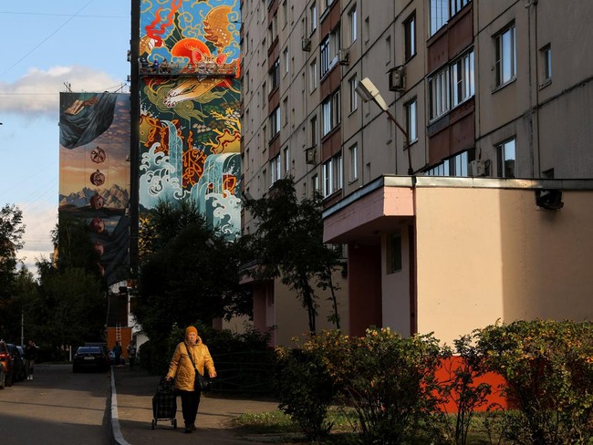 Rusia - Mural terlihat di sepanjang jalan blok apartemen bertingkat saat Festival Internasional Urban Morphogenesis di Kota Balashikha, Moskow, Rusia. Keren deh.