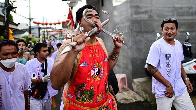 Thailand - Phuket punya sebuah parade ekstrem tiap tahunnya, Festival Vegetarian. Dalam kegiatannya, parade ini mempertontonkan aksi tusuk pedang sebagai ucapan syukur.