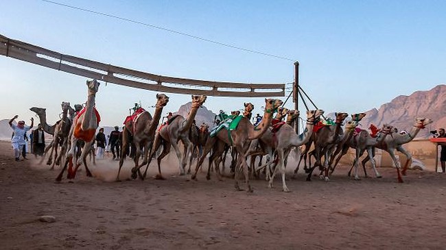 Yordania - 500 unta balapan di gurun Yordania dalam Festival Balapan Unta 2022. Balapan unta menjadi salah satu kegiatan tradisional yang dinanti masyarakat Timur Tengah.