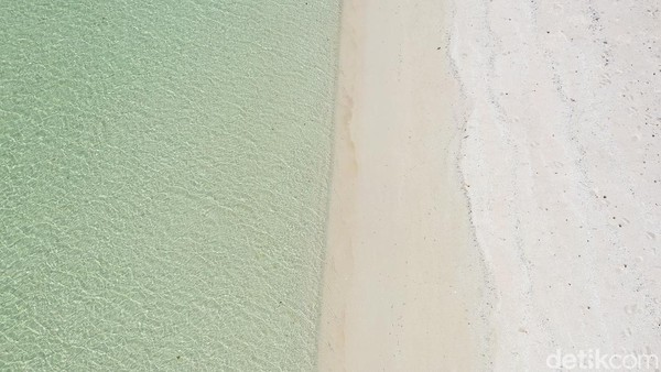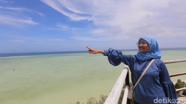Dari atas rambu suar, bisa dilihat indahnya air laut yang jernih terhampar di sejauh mata memandang. Di bagian lainnya, air terlihat berwarna biru cerah, senada dengan warna langit yang masih sangat bersih. Hamparan pasir putihnya juga menjadi obat penenang hati.