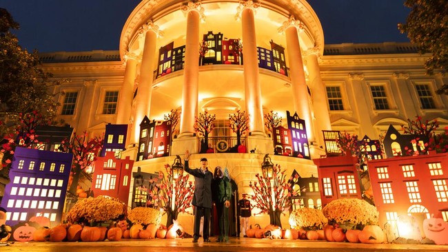 Amerika Serikat - Gedung Putih kembali menggelar perayaan Halloween. Dekorasi khas Halloween tampak meriah di Gedung Putih saat Presiden Joe Biden menyambut para tamu.