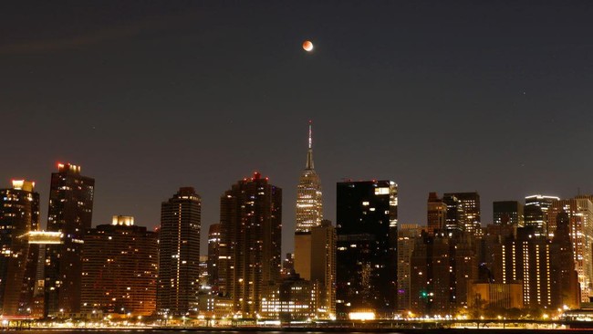New York - Fenomena gerhana bulan total juga terjadi di New York, Amerika Serikat. Keindahannya berpadu dengan megahnya gedung Empire State.