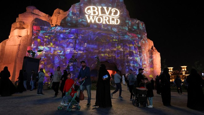 Sejumlah pengunjung mendatangi upacara pembukaan Boulevard World, selama Musim Riyadh 2022, Riyadh, Arab Saudi, Senin (21/11/2022).
