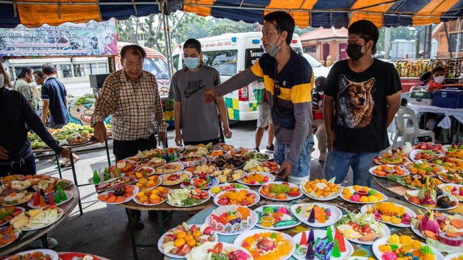 Sejumlah warga menyiapkan buah-buahan di atas meja untuk Festival Monyet Lopburi di Lopburi, Thailand, Minggu (27/11/2022).