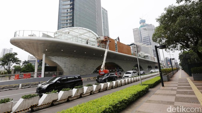 Jakarta - Pembangunan Halte TransJakarta Tosari sudah mulai terlihat wujudnya. Halte itu menyerupai kapal pesiar yang sedang berlabuh di Jalan Jenderal Sudirman, Jakarta.