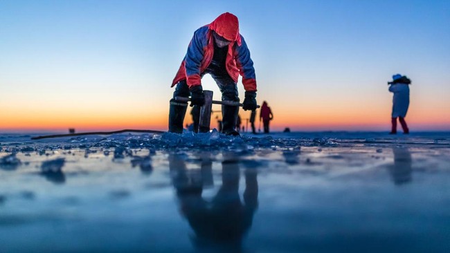 Seru Banget! Potret Warga China Menjaring Ikan di Danau Beku