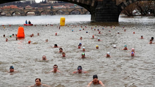 Ceko - Lomba renang musim dingin di Praha kembali digelar. 350 peserta harus berenang di Sungai Vltava saat suhu air sungai mencapai 5 derajat celcius.