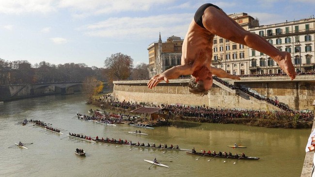 Italia - Puluhan orang di Italia melompat dari ketinggian 18 meter untuk berenang di sungai. Aksi ini dilakukan untuk merayakan tahun baru di Roma.