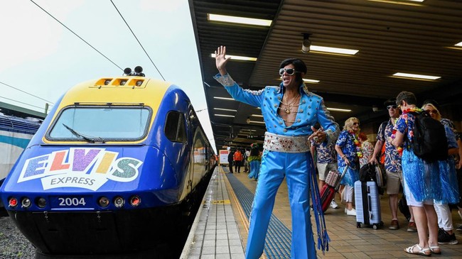 Australia - Lusinan penggemar Elvis Presley membanjiri Stasiun Utama Sydney, Australia. Dengan bergaya ala Raja Rock and Roll, mereka siap hadir di festival Elvis Presley.