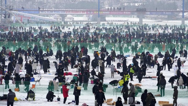 Korea Selatan - Warga Korea Selatan ramai-ramai ikut kontes menangkap ikan di sungai beku. Kontes ini merupakan bagian dari festival es tahunan.
