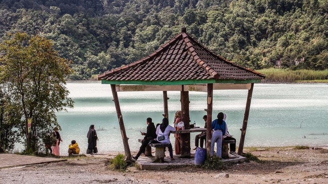 Masyarakat menikmati pemandangan Kawah Talaga Bodas di Garut, Sabtu (7/1/2023). Talaga Bodas Garut menjadi salah satu destinasi wisata populer di Jawa Barat tepatnya di Garut.