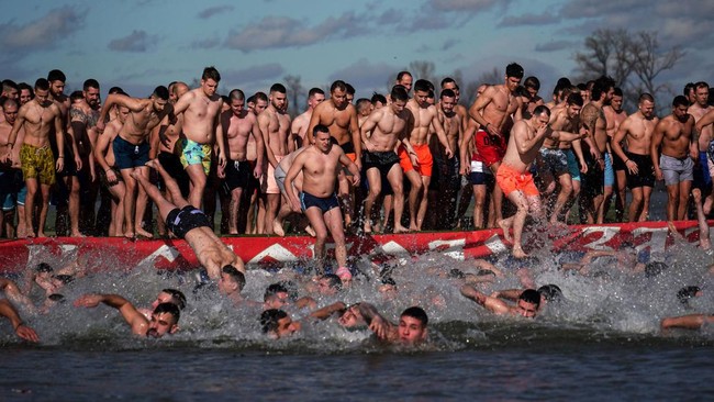 Serbia - Umat Kristen Ortodoks di Serbia merayakan Hari Epiphany. Mereka serempak berenang di perairan dingin Sungai Danube. Begini keseruannya.