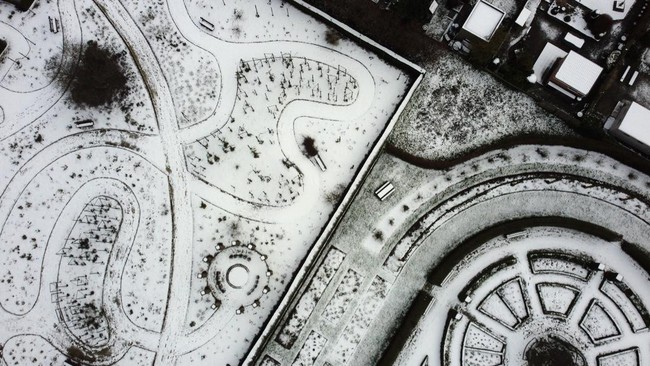 Belgia - Salju menyelimuti Taman Mawar Coloma yang terdiri dari taman merah-putih. Salju putih berkilau itu menggantikan warna cerah mawar di taman.