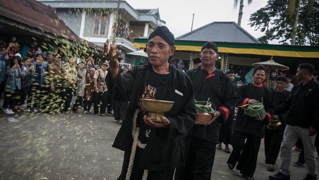 Tokoh adat desa menabur beras kuning pada Tradisi Mondosiyo di Dusun Pancot, Kalisoro, Tawangmangu, Karanganyar, Jawa Tengah, Selasa (24/1/2023). Tradisi yang digelar setiap tujuh lapan sekali atau tiap Selasa Kliwon Wuku Mondosiyo dalam penanggalan Jawa tersebut merupakan wujud syukur warga dusun kepada Tuhan YME atas limpahan berkah dan rezeki yang diberikan.
