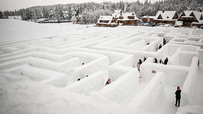 Polandia - Liburan musim dingin di Polandia, traveler bisa main di labirin es raksasa. Labirin yang terbuat dari 60.000 buah balok salju ini disebut yang terbesar di dunia