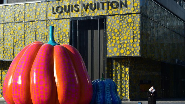 Beijing - Patung labu raksasa ini merupakan karya seniman Jepang Yayoi Kusama. Labu raksasa ini berada di depan toko Louis Vuitton di Beijing, China.