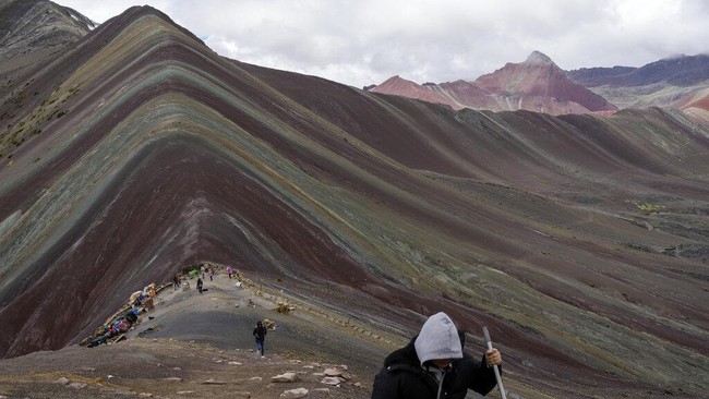Peru - Jalan-jalan di atas pelangi mungkin hanya khayalan semata, tapi traveler bisa mengunjungi gunung warna-warni bak pelangi di Peru. Seperti apa sih?