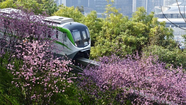 China - Bunga plum bermekaran di sepanjang jalur monorel di Chongqing, China. Pemandangan kereta api saat melintasi lautan bunga ini sungguh memesona.
