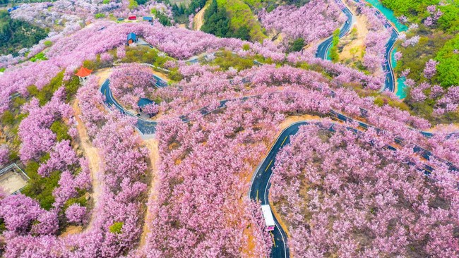 Pemandangan udara bunga sakura yang mekar penuh di taman bunga sakura di Sanming, Provinsi Fujian, China, Rabu (1/3/2023).