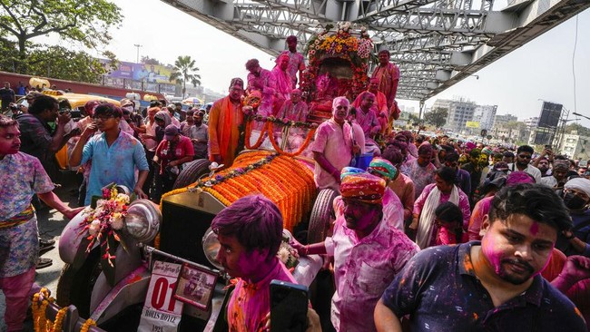 Umat Hindu berkerumun di sekitar mobil Rolls Royce 1921 yang dimodifikasi membawa patung dewa Krishna melalui bangunan bersejarah Howrah Bridge selama festival Holi di Kolkata, India, Minggu (5/3/2023). AP/Bikas Das