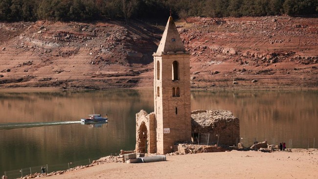 Ini dia penampakan sebuah gereja berusia 1.000 tahun bernama Sant Roma yang muncul kembali dari tepi Waduk Sau saat kekeringan ekstrem melanda Spanyol. Foto ini dijepret pada 15 Maret 2023 lalu.