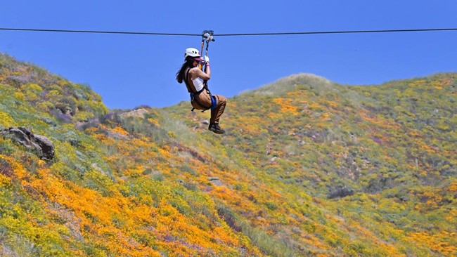 Seorang wanita meluncur di atas bunga liar yang bermekaran di Skull Canyon Ziplines, Corona, California, Amerika Serikat, Rabu (11/4/2023).