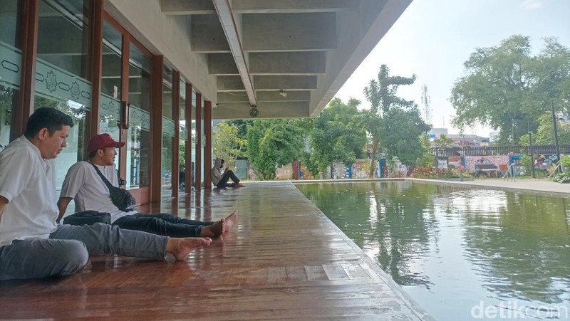 Lelah menjelajah TIM, traveler dapat santai sejenak di sini. Duduk di pelataran masjid sambil memandang kolam bertabur ikan, jadi hiburan sulit dilewatkan. Nongkrong di sini juga bisa jadi opsi, nongki santai. Foto: Weka Kanaka/detikcom