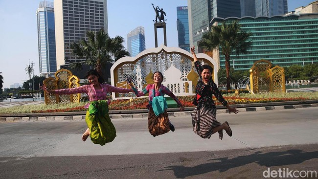 Jakarta - Kawasan Bundaran HI tepatnya di Jalan Sudirman lengang pada hari raya Idul Fitri 2023. Momen langka ini dimanfaatkan warga untuk foto-foto di tengah jalan.
