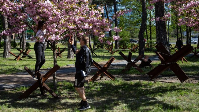Ukraina - Besi landak anti-tank bertebaran di taman bunga sakura Ukraina. Besi itu diletakkan untuk menjaga taman dari gempuran pasukan Rusia.