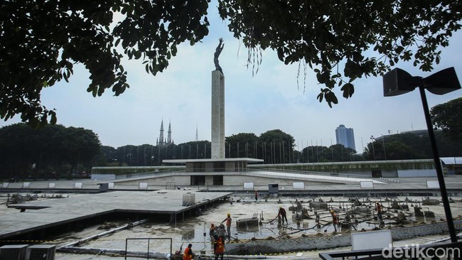 Jakarta - Atraksi air mancur di Lapangan Banteng, Jakarta, sementara ditiadakan imbas perawatan dan pemeliharaan.