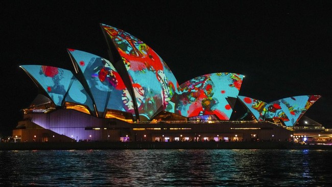 Layar Sydney Opera House diterangi sebagai bagian dari festival Vivid di Sydney, Australia, Senin, 29 Mei 2023.