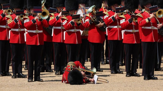 Inggris - Ada peristiwa mengejutkan saat tentara Kerajaan Inggris berlatih di bawah terik matahari menjelang ulang tahun Raja Charles III. Tiga tentara pingsan.