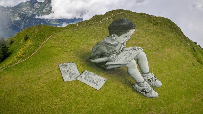 Swiss - Seniman Swiss-Prancis SAYPE kembali membuat karya lukis raksasa di lerneg gunung. Kali ini bergambar anak-anak yang sedang melukis.