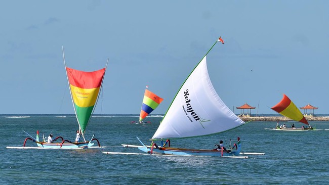 Bali - Sejumlah nelayan mengikuti parade jukung di perairan Sanur, Denpasar, Bali. Parade ini sekaligus untuk mempertahankan eksistensi para nelayan tradisional.