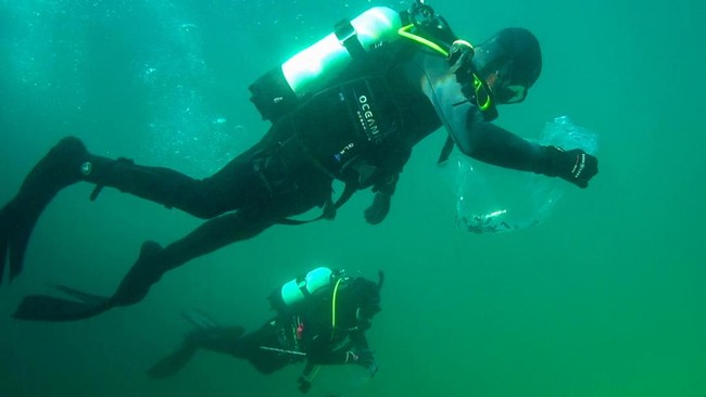 Penyelam berenang dengan tas kuda laut putih untuk dilepaskan di dekat hotel kuda laut di Sydney, Australia, 18 Juli 2023. Lebih dari 350 kuda laut putih langka dilepasliarkan ke laut.