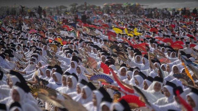 Ribuan pelajar menarikan tarian montro saat pemecahan rekor Musium Rekor Indonesia (MURI) tari montro dengan jumlah penari terbanyak di Pantai Parangkusumo, Bantul, D.I Yogyakarta, Sabtu (26/8/2023).