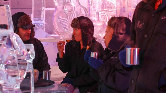 Sejumlah pengunjung tampak menikmati menu makanan yang ada di Chillout Ice Lounge di Dubai, Uni Emirates Arab, Senin (28/8/2023).
