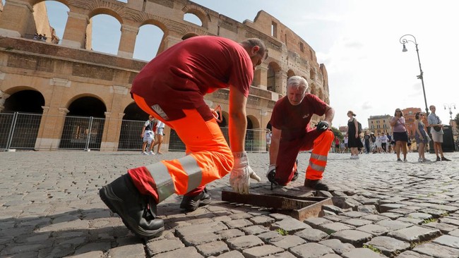 Ini momen saat para petugas menyusuri kawasan Colosseum termasuk saluran air yang biasa menjadi sarang tikus, Kamis (31/8/2023).