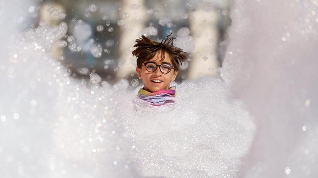 Peserta lari di tengah busa selama acara lari amal 'Colour My Run' di Ta' Xbiex, Malta, Minggu (15/10/2023).