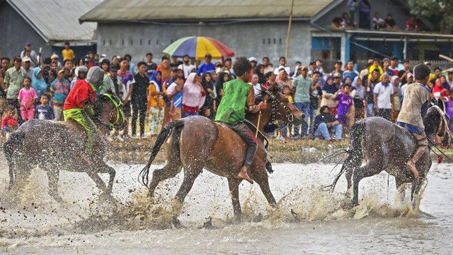 Aksi Joki Cilik Memacu Kuda Lumpur di Dompu NTB