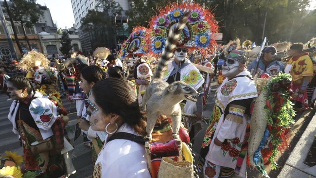 Meksiko - Warga Meksiko merayakan parade hari kematian di jalanan kota. Perayaan ini berlangsung meriah.