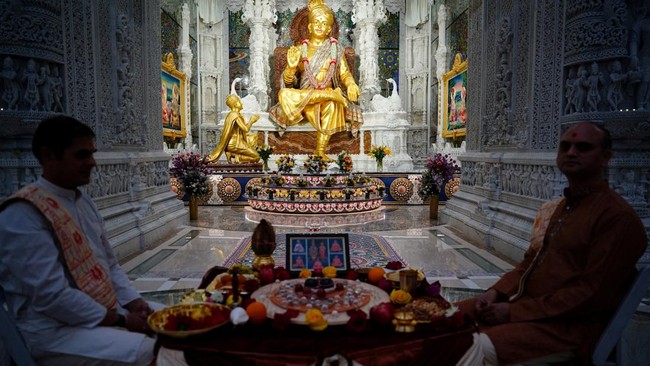 Para penyembah mengambil bagian dalam ritual pemujaan Mahapuja di depan patung Bhagwan Swaminarayan selama Diwali di dalam BAPS Swaminarayan Akshardham di Robbinsville, New Jersey, Amerika Serikat, Minggu (12/11/2023).
