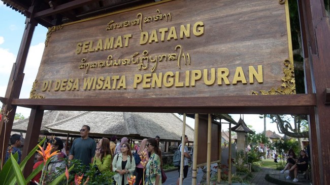 “Selamat Datang di Desa Wisata Penglipuran” tertulis di papan warna cokelat, menyambut wisatawan di salah satu pintu masuk menuju permukiman.
