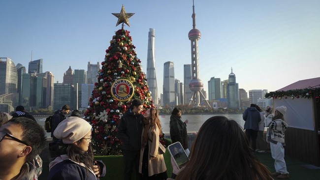 Orang-orang mengambil gambar pohon Natal yang dihias di sepanjang Shanghai Bund menghadap Distrik Keuangan Pudong di Shanghai pada 17 Desember 2023. Seperti festival barat lainnya, Natal tidak dirayakan secara tradisional di China, tetapi sudah menjadi hal yang umum di kalangan anak muda Tiongkok di kota-kota besar seperti Shanghai.