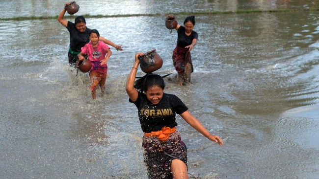 Sejumlah peserta berlari sambil menjunjung gentong saat mengikuti permainan tradisional di Desa Suwat, Gianyar, Bali, Sabtu (30/12/2023).